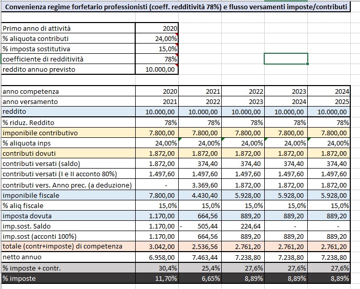 Il foglio di calcolo sviluppa su 5 anni la tassazione e la contribuzione dovute aderendo al c.d. regime forfettario.